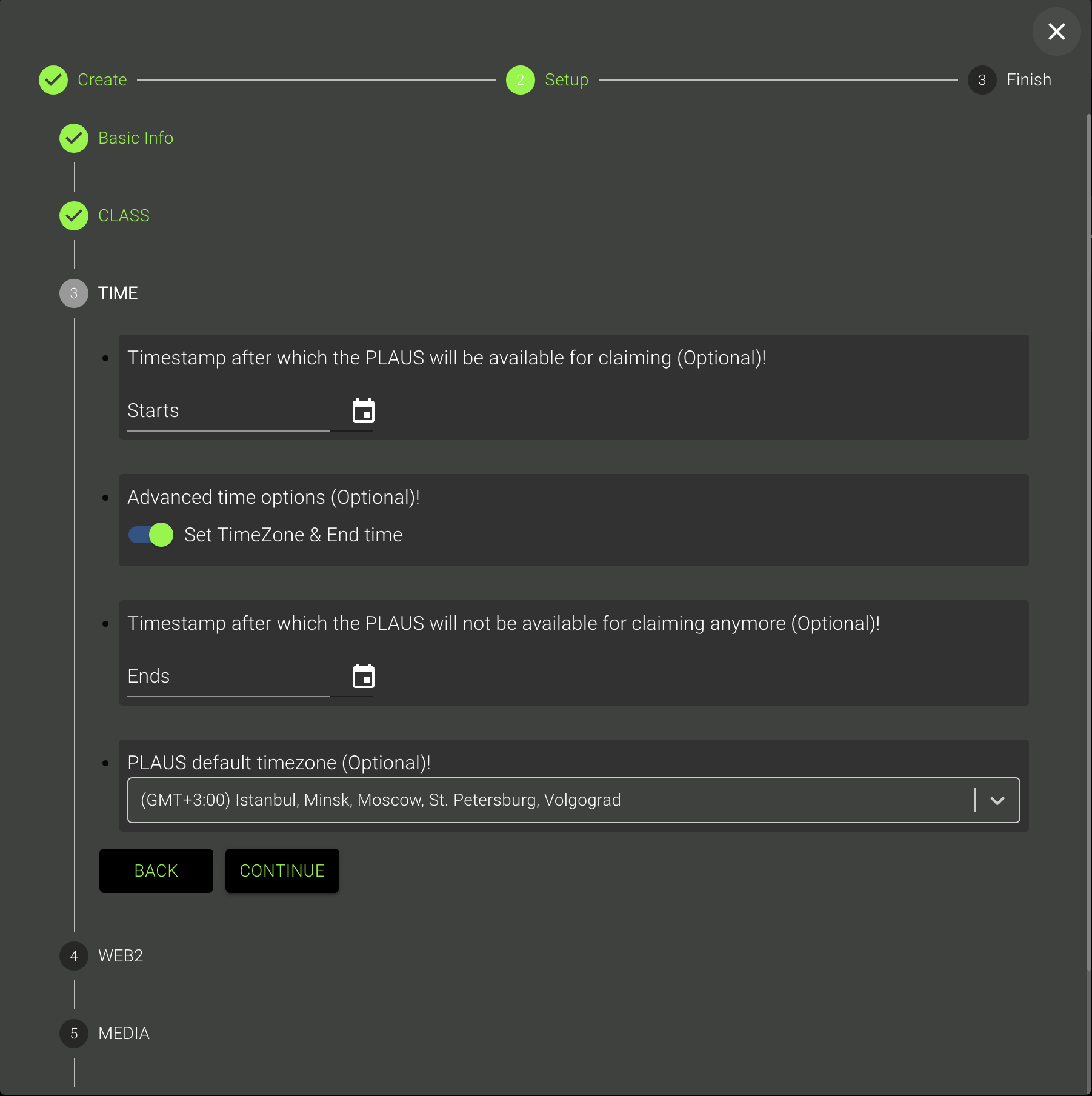 * ***Ends:***  Timestamp in which the PLAUS will not be available for claiming anymore (Optional)